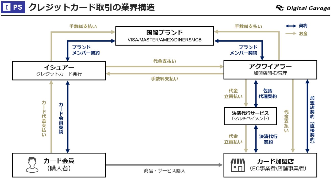 VisaやMasterCardなどの国際ブランドとカード発行会社(イシュア)、事業者(加盟店)管理会社(アクワイアラ)の3者によってクレカ決済が円滑に機能します。