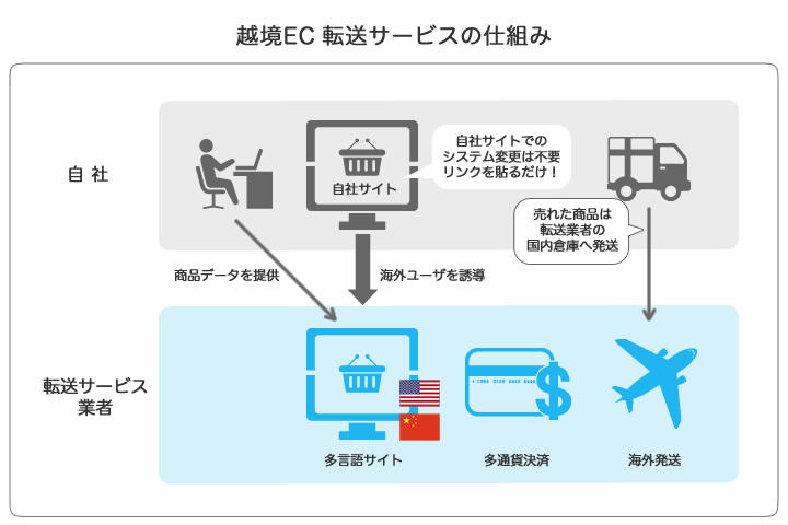 - 外国語対応や海外発送を委託できる「転送サービス」を使えば、少ない運用負担で越境ECをスタートできる